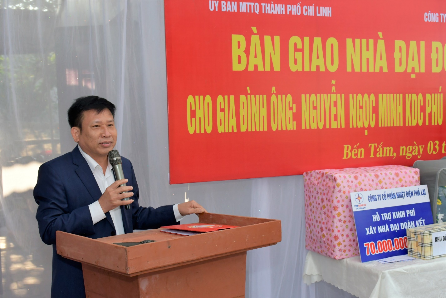 Ông Lê Văn Chính - Phó Bí thư thường trực Đảng ủy, Chủ tịch Công đoàn PPC và ông Trần Văn Dược – Thành ủy viên, Chủ tịch Ủy ban Mặt trận Tổ quốc thành phố Chí Linh trao hỗ trợ kinh phí cho bà Mạc Thị BíchHai gia đình được trao nhà đại đoàn kết: gia đình ông Nguyễn Ngọc Minh địa chỉ Khu dân cư Phú Lợi, phường Bến Tắm và gia đình bà Mạc Thị Bích địa chỉ Khu dân cư Khang Thọ, phường Chí Minh đều có hoàn cảnh khó khăn như bản thân sức khỏe yếu, sống đơn thân nuôi con ăn học, thu nhập không ổn định, trước đây đều đi ở nhờ người thân không có khả năng xây nhà.